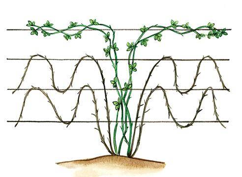 - Крепкие побеги нужно подвязывать. Сооружается опора из стоек, высотой до двух метров, крепится три проволочных ряда. Побеги наклоняются к грунту во избежание поломки, когда они будут укладываться под укрытие на зимовку.