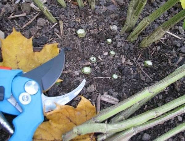 На зимний период многими цветоводами выкапываются кусты и размещаются в подвалах, после того, как растения будут упакованы в ведра или картонные и деревянные коробки. Такой процесс является достаточно трудоемким и, как правило, себя не оправдывает, поэтому целесообразно просто засыпать обрезанные цветочные кусты смесью, на основе садового грунта с сухим перегноем.
