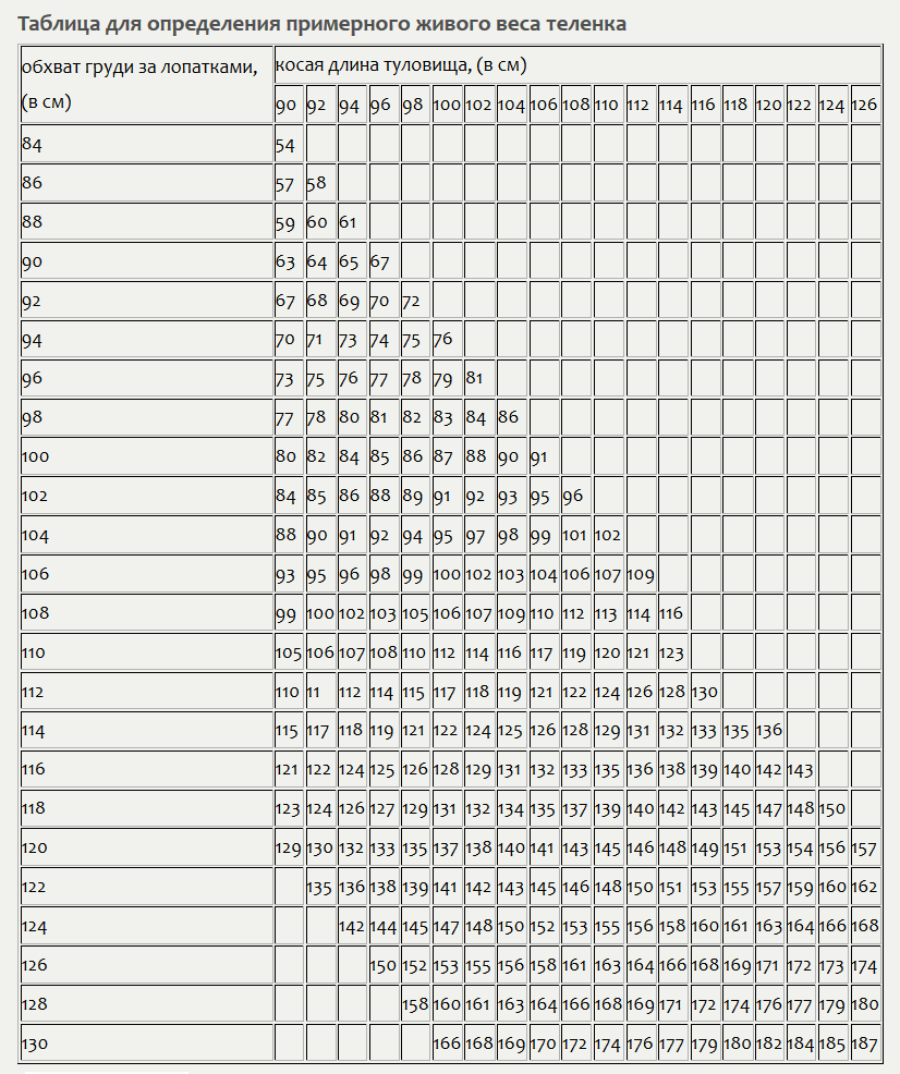 Таблица для определения живого веса теленка