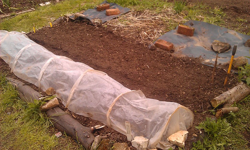 - для защиты от ночных заморозков над грядками устанавливается укрытие из пленки, которая крепится на дуги из проволоки;