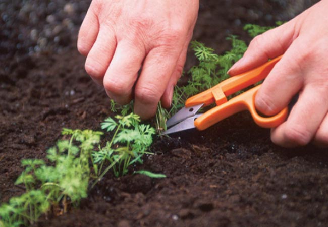 Этот метод подразумевает применение обыкновенных ножниц. При этом между саженцами нужно оставлять расстояние в 4 см. Для проведения процедуры нужно ножницами обрезать зелень под корень. При этом сами корешки должны оставаться в земле.