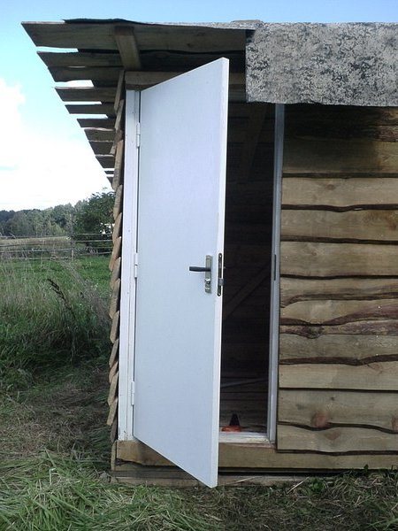 Дверь делают из досок, сбитых по диагонали, положив между ними прослойку из рубероида, чтобы не выпускать тепло.