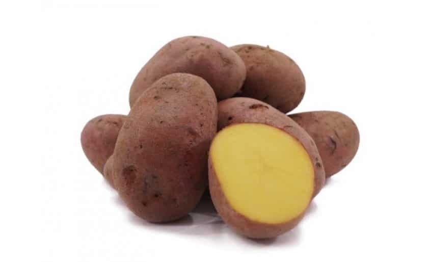 Овальные корнеплоды окрашены в розовый цвет. Глазки мелкие, малочисленные. Мякоть плотная, желтого окраса.