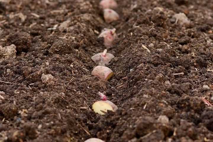 - Клубни покрывают грунтом, смешанным с удобрениями. Для перепревшего навоза норма составляет 2–3 ведра на 1 кв. м грунта. Навоз обеспечивает клубни калием, необходимым для образования крахмала.