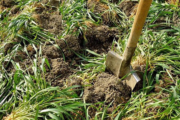 - Ранней весной скосить всю имеющуюся зелень. Затем перекопать ее вместе с землей на глубину 12-15 см (для легких почв) либо 6-8 см (для тяжелых).