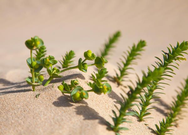 Миртолистный молочай – невысокая до 25 сантиметров кустарниковая флора со стелющимися стеблями. Густо усеян небольшими от 1,5 до 3 см длиной двоякими листьями ромбовидной формы, серо-голубого цвета. Цветет дважды в год – в апреле и июле небольшими (до 1,5 см в диаметре) бледно-желтыми цветкам.
