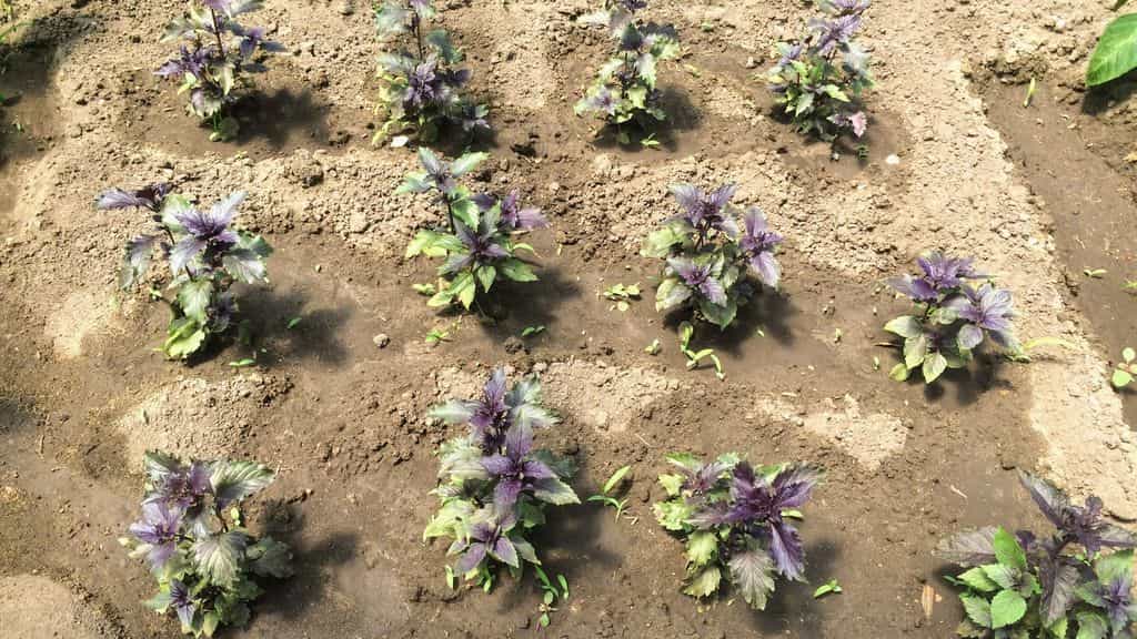 Свободная высадка семян или шахматный порядок. Чтобы увеличить процент всхожести семян, можно предварительно разделить участок на мелкие бороздки с углублением в 2-3 сантиметра и расстоянием между ними в 25-30 сантиметров. Шахматный метод посадки семян базилика не менее популярен.