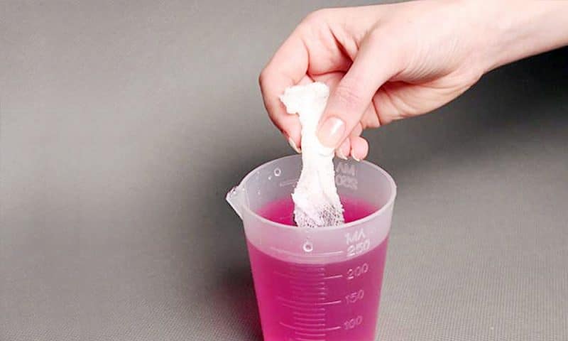 - Приготовить 1 % раствор марганцовки: по 1 гр перманганата калия на каждые 100 мл тёплой воды. Должна получиться жидкость тёмно-розового цвета.