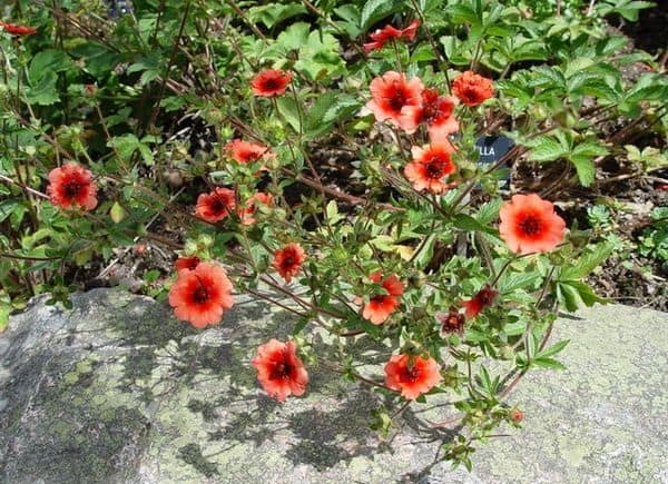 Лапчатка гибридная (Potentilla х hybrida) – в этот вид входит много садовых гибридных форм растения. Стебли прямые и сильноветвящиеся сверху. Вырастают до 1 м в высоту. Листья тройчатой или пильчатой формы. Цветки бархатистые красного, желтого, пурпурного или розового цвета