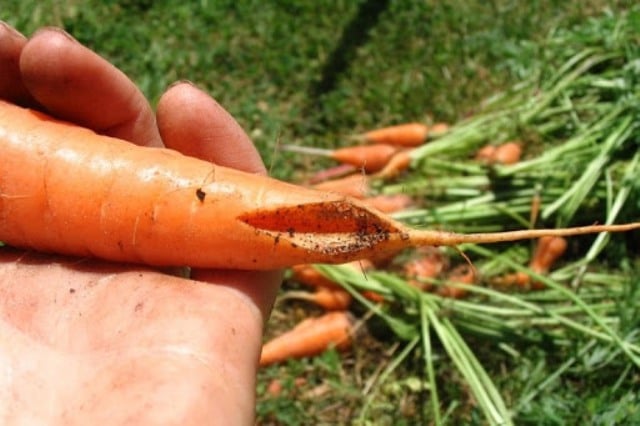 Как выкапывать морковь? Используйте вилы, чтобы приподнять земляной ком, затем крепко потяните за основание морковной ботвы, слегка поворачивая ее, если нужно. Это должно освободить морковь от почвы и облегчить ее выдергивание, не оторвав ботву.