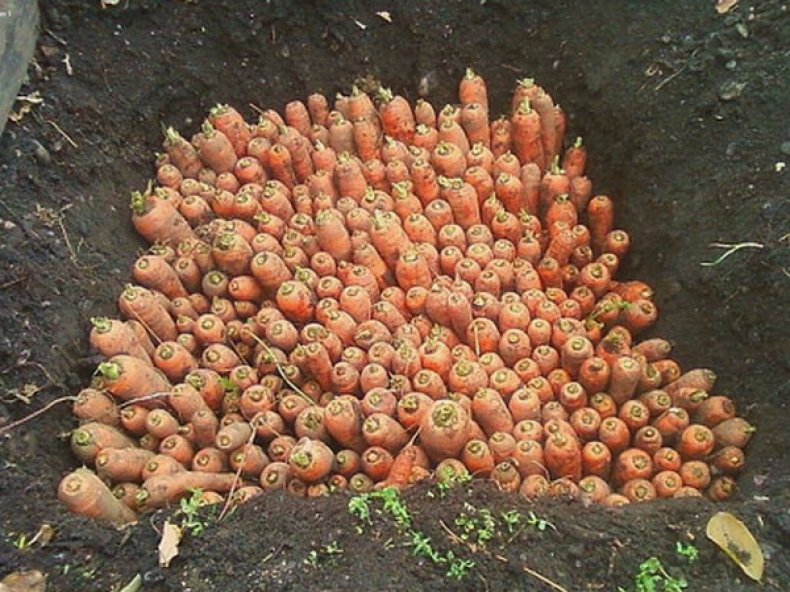 Если нет подвала и других похожих помещений, в которых можно было бы организовать место для моркови, хранить ее можно непосредственно на огороде, в земле.