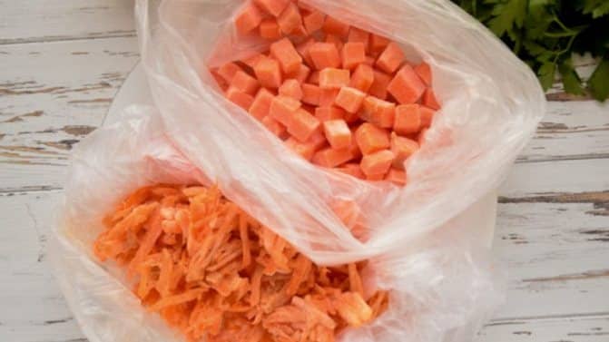 | Заморозка (нарезанная) | Морковь вымыть, очистить, нарезать кубиками/кружочками/соломкой. Бланшировать 2-3 минуты, охладить, обсушить и заморозить в пакетах или контейнерах. | 8-12 месяцев |