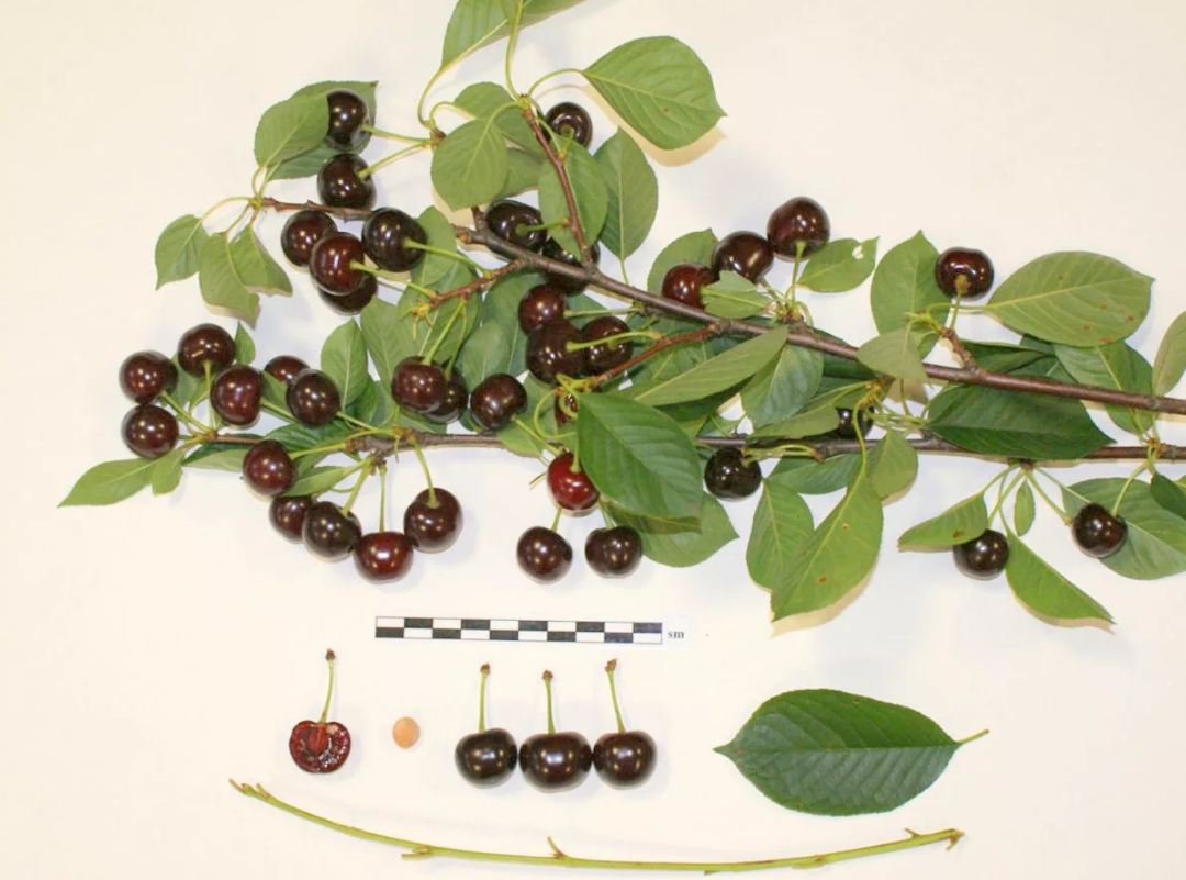 Вишни темно-коричневого оттенка, плотные на ощупь, с длинными плодоножками. Мякоть плодов обладает сочностью и легкой кислинкой.