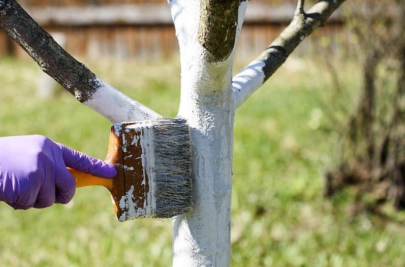 - Побелка. Осенью, когда температура опускается до 10 градусов, белят стволы деревьев. Это защитит кору от вредителей и предотвратит растрескивание в период зимних оттепелей.