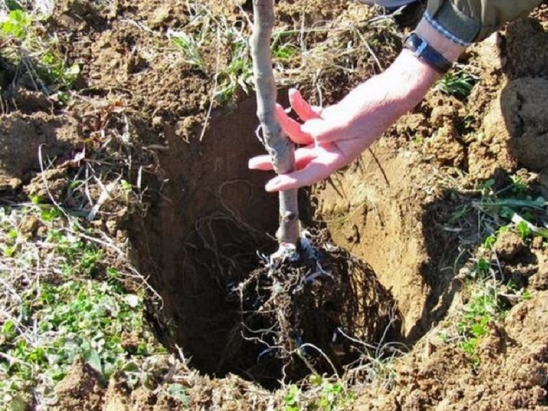 - Аккуратно расправьте корни саженца и установите его в лунке так, чтобы корневая шейка находилась на 2-3 см выше уровня почвы.