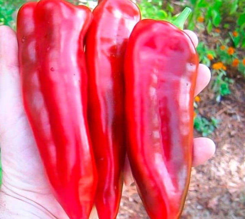 Достаточно небольшой для перцев кустарник высотой всего в 35-50 сантиметров. Длинные конусовидные плоды размером в 20 сантиметров имеют гладкую глянцевую поверхность и окрашены в темно-красный цвет. Их вес не превышает 200 грамм.