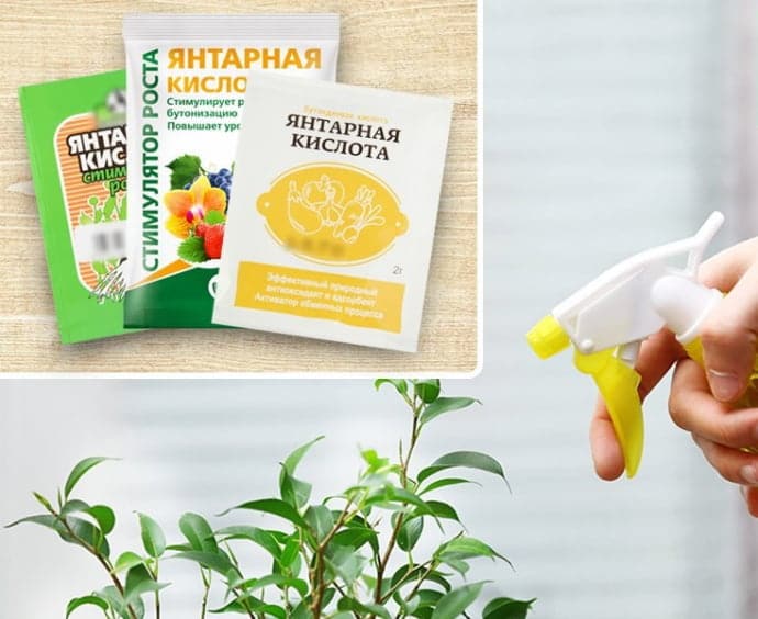 - Кислота способствует ростку побегов. Растения опрыскивают слабым раствором янтарки с интервалом в 2 недели.