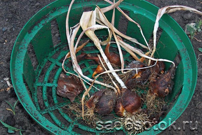 После цветения, когда засохнут листочки и стебель культуры, необходимо дождаться сухого, солнечного дня и именно тогда проводить выкапывание луковиц. Чтобы не повредить их, ориентироваться, где копать нужно по остаткам стеблей и листьев (не стоит их убирать с участка до выкапывания).