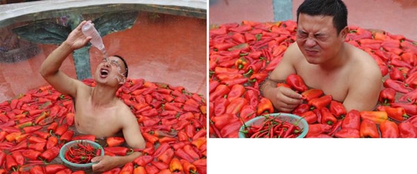 9 июля 2018 года двенадцать китайцев собрались у одного из прудов в юго-восточной части Китая, в округе Циньян, провинция Ганьсу, чтобы принять участие в соревновании по поеданию самых острых перцев в мире. Это мероприятие было организовано в рамках Фестиваля огня и льда и заключалось в том, что каждый из участников должен был забраться в бочку с холодной водой и попытаться съесть как можно больше острых перцев.