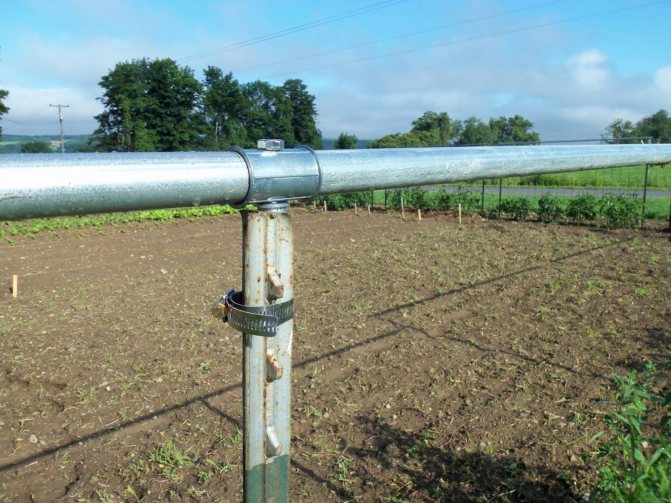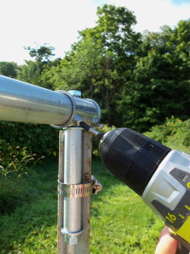 6. Далее опоры соединяют с помощью труб. Это придаст конструкции необходимую жёсткость и не позволит ей наклоняться. Для этой цели используют металлические элементы с меньшим диаметром.