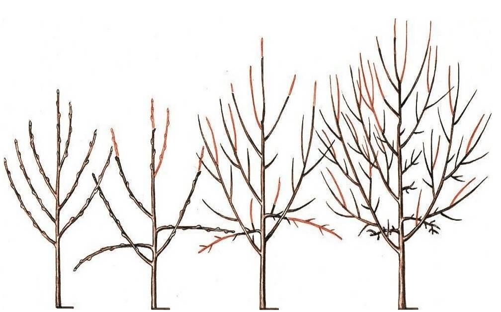 Способ обрезки подбирается с учетом возраста, формы и сорта плодовых деревьев. Но в любом случае необходимо придерживаться при формировании вишни следующей схемы: