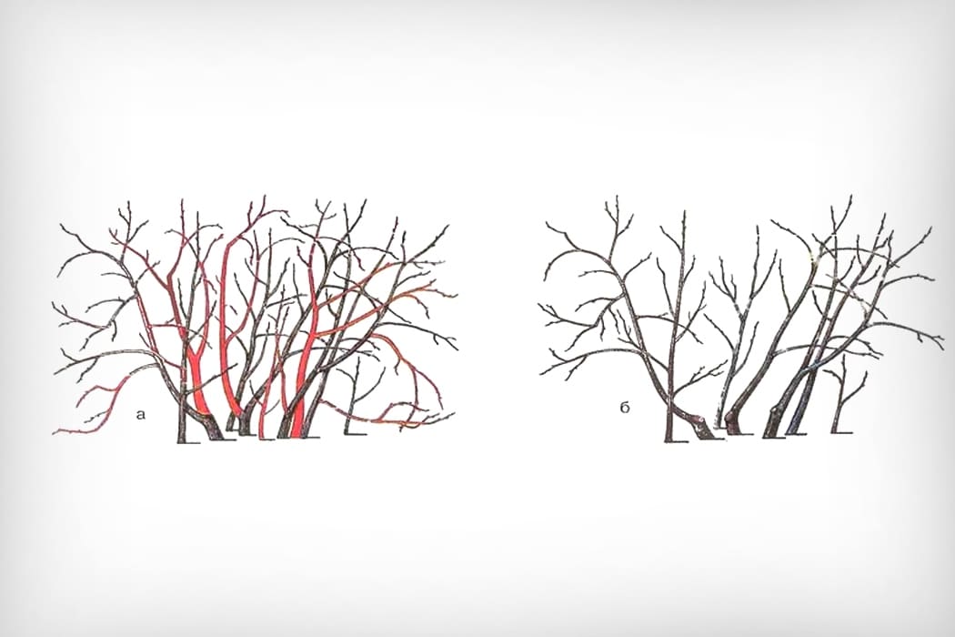 Кустовидные сорта имеют свойство сильно разрастаться в течение летнего периода. С наступлением осенней поры они нуждаются в прореживании. С растения удаляются порослевые ветки, обрезаются подсохшие, неправильно растущие и больные побеги.