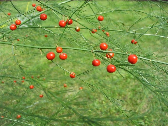 Этот вид семейства спаржевых является двудомным растением, подразделяемым на «мужское» и «женское». Цветки первого типа образуют пыльцу, второго – красные несъедобные плоды. В них содержится до 2 семечек, которые в течение 5 лет пригодны для выращивания.