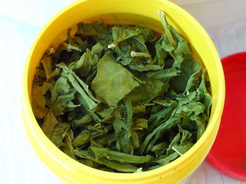 Сроки сбора урожая можно определить и по внешнему виду шпината. Заготовку рекомендуется проводить, когда на растении образуется 5-6 листьев. Для этого необходимо аккуратно срезать листья у основания. Затем их следует тщательно промыть и удалить излишки влаги с помощью бумажного полотенца. После этого листья раскладывают в один слой в темном, хорошо проветриваемом помещении для просушки в течение 4 недель. После сушки зелень измельчают и хранят в керамической емкости.